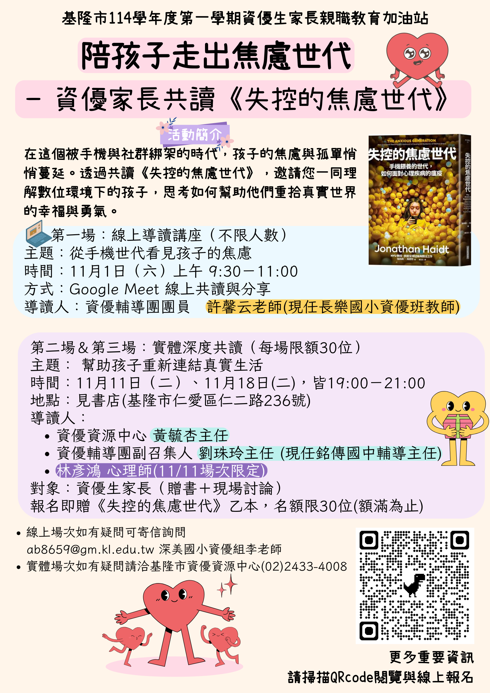 - 主題「資優生家長讀書會-陪孩子走出焦慮世代」,資訊: