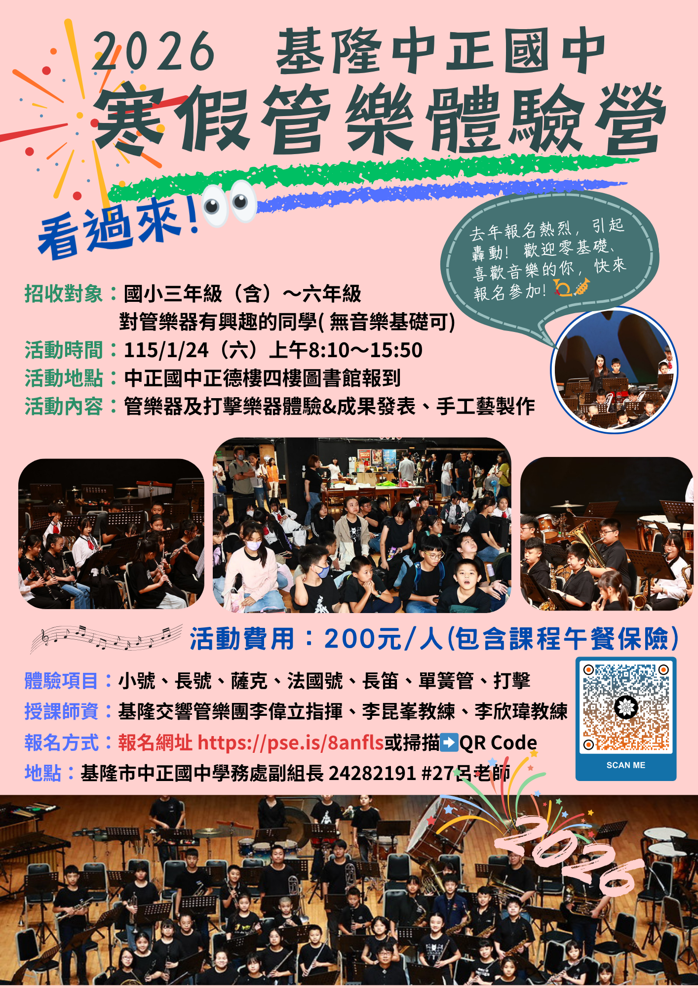 轉知~基隆市立中正國民中學「2026小小樂手」體驗營